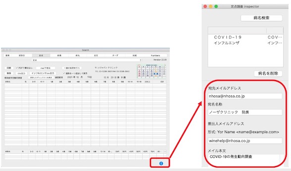 3. 「mailで送る」ボタンを押すと、csvファイル(設定した病名の定点調査)が添付されたメールが宛先に自動送信されます